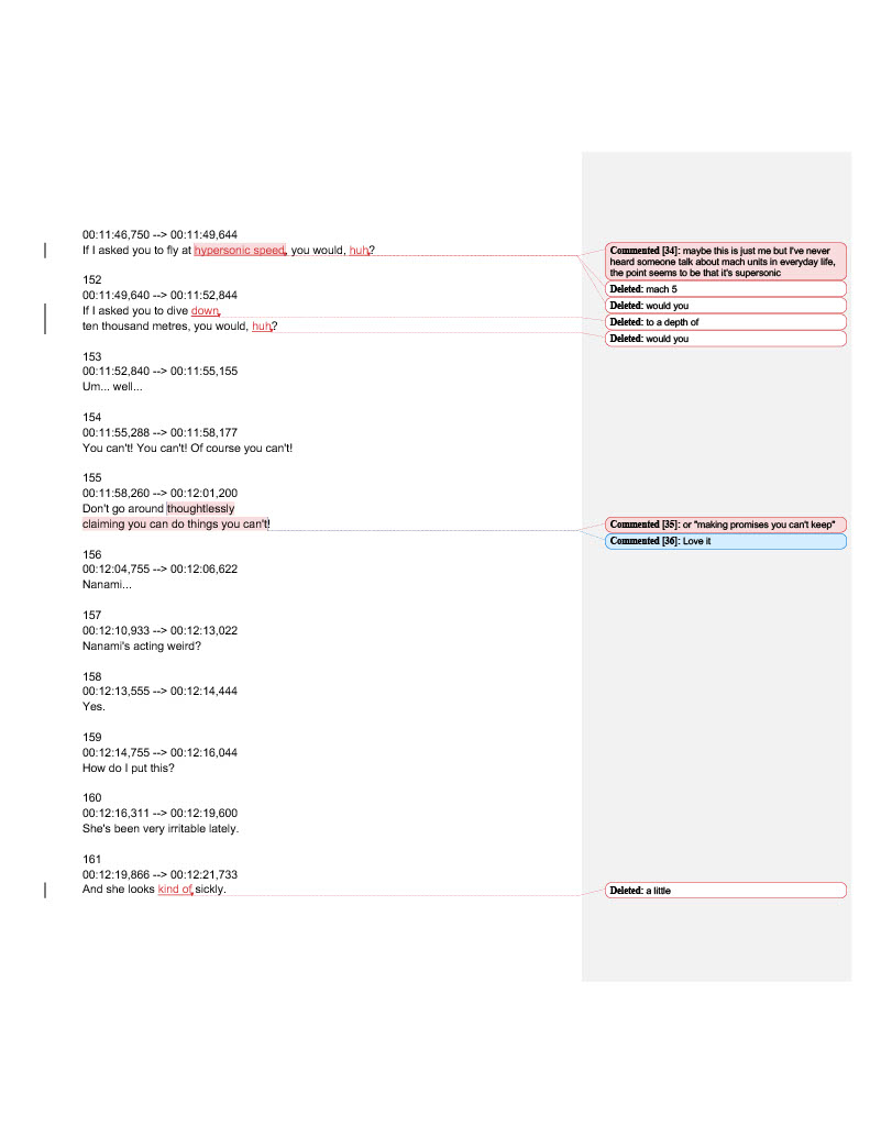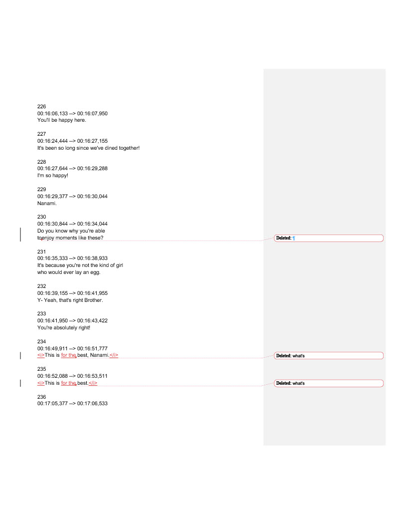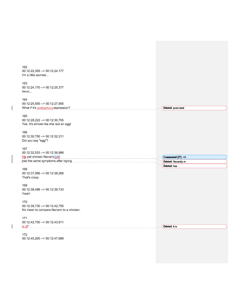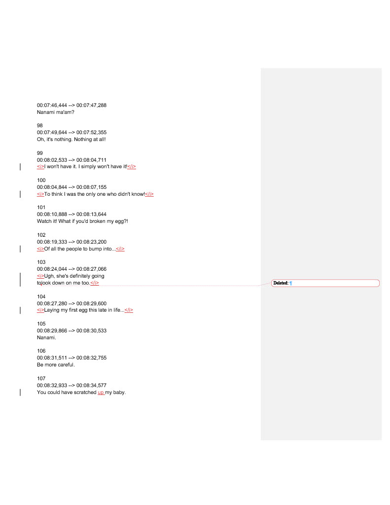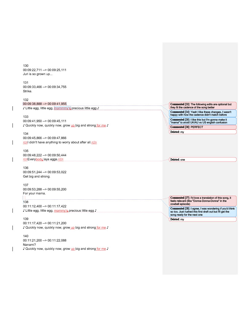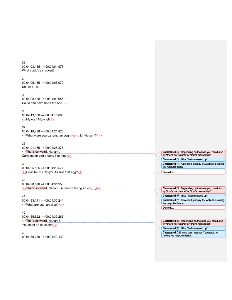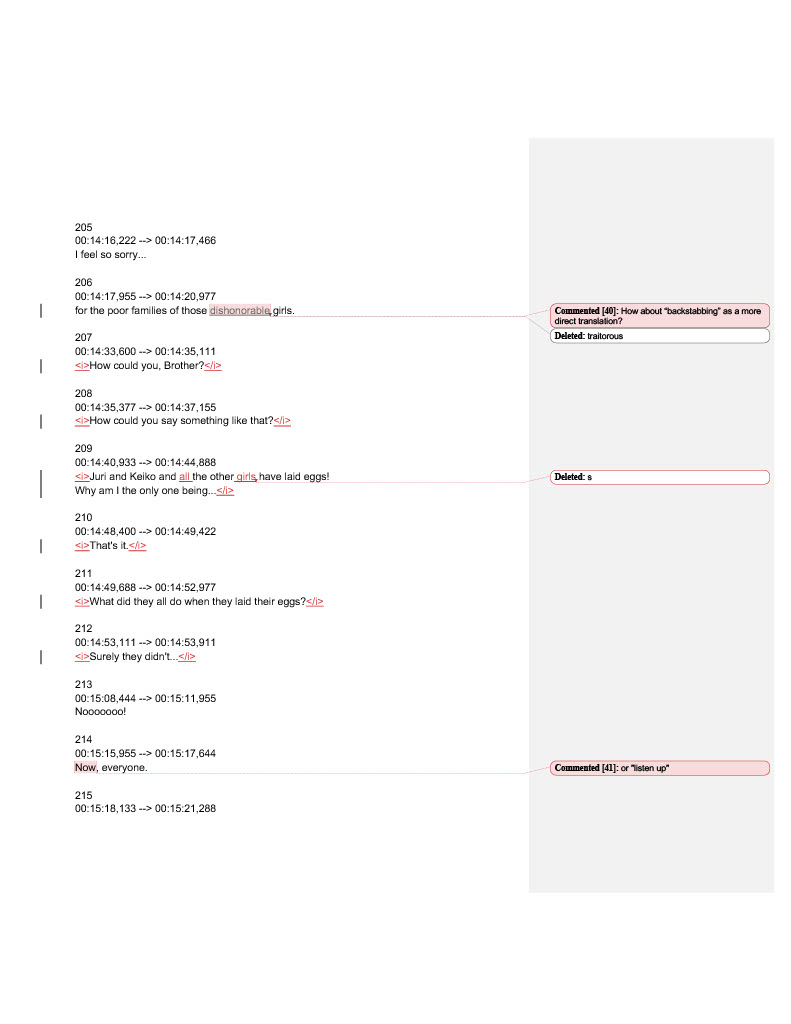 As editor, my job is to provide feedback on multiple levels. On the most basic level, I proofread each line and ensure that they are stylistically consistent with current stylistic guidelines for foreign language subtitles. I ensure that each line tracks easily in the time it is on the screen and that they are consistent across scenes and episodes.