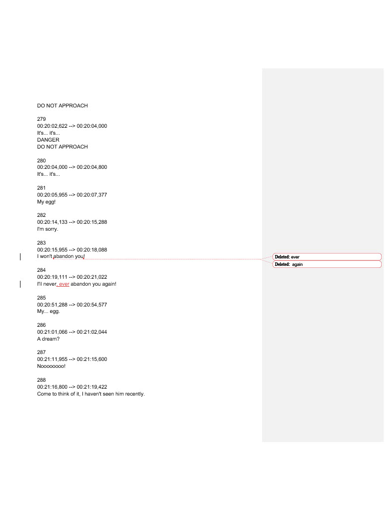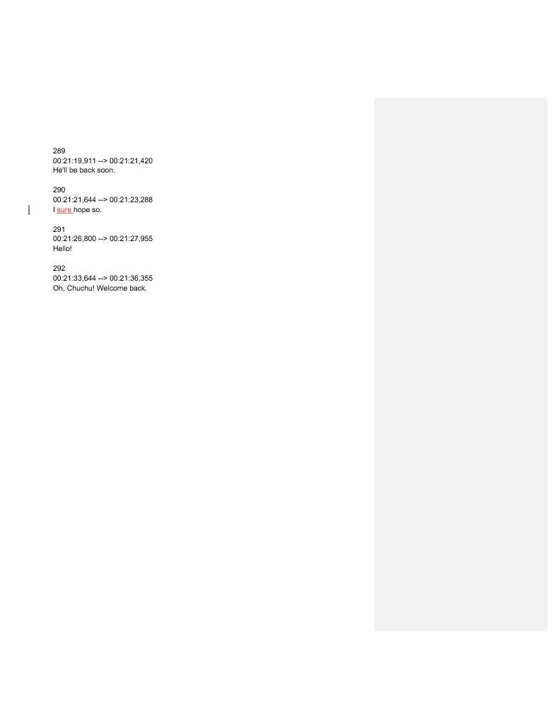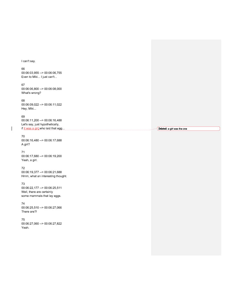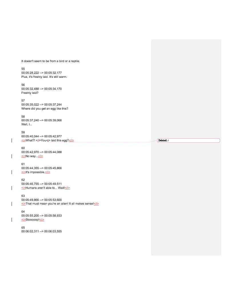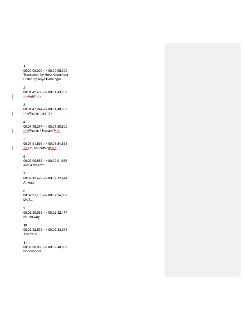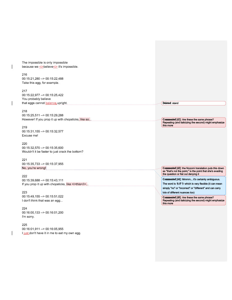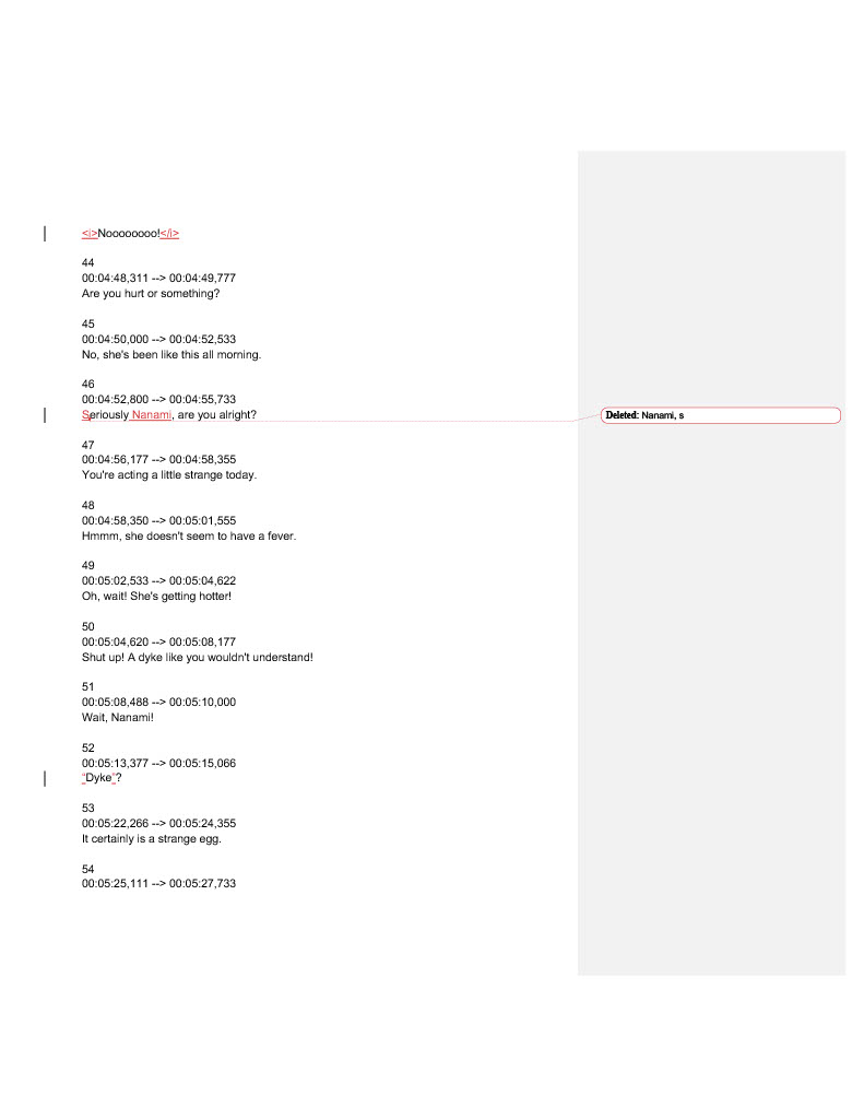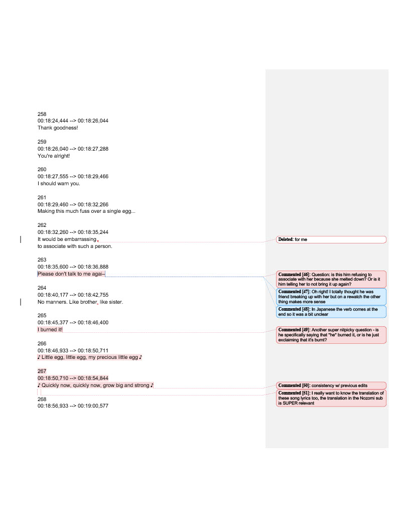 As editor, my job is to provide feedback on multiple levels. On the most basic level, I proofread each line and ensure that they are stylistically consistent with current stylistic guidelines for foreign language subtitles. I ensure that each line tracks easily in the time it is on the screen and that they are consistent across scenes and episodes.