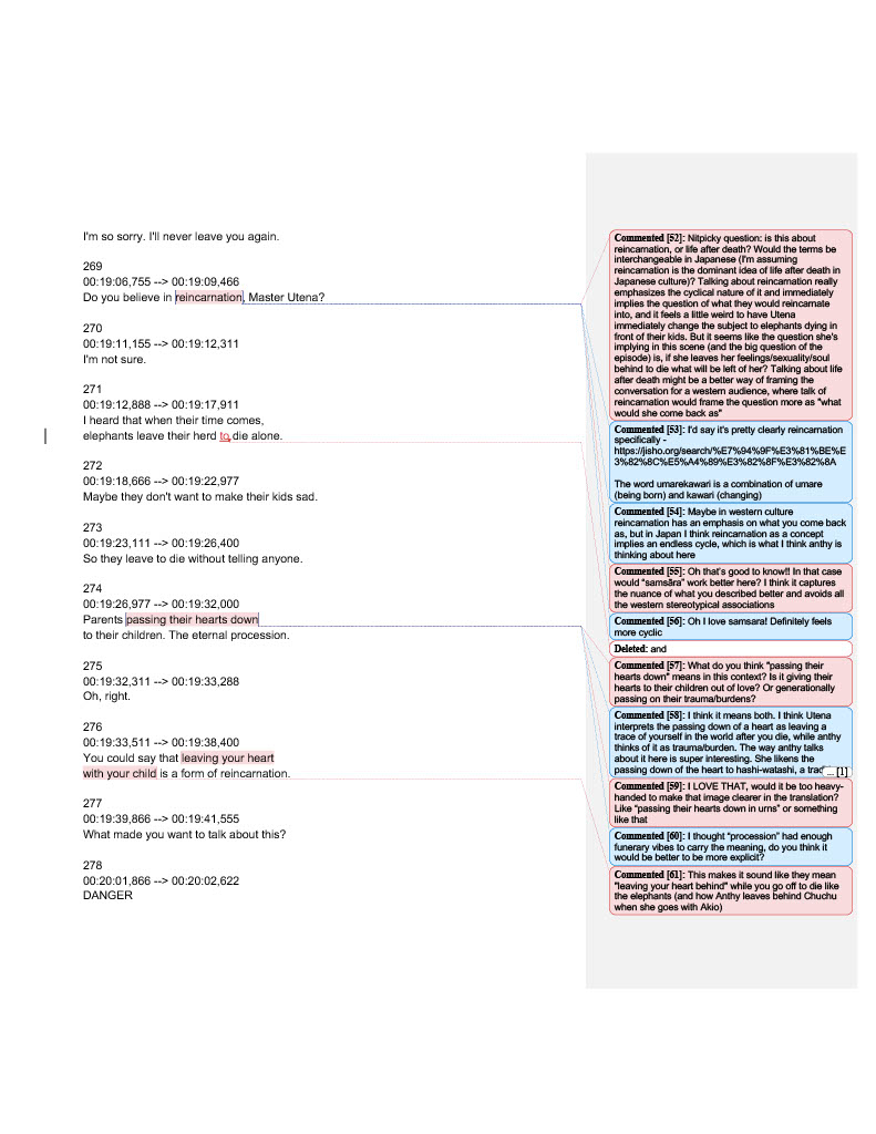 Finally, I ensure that all of these moving parts consistently support the central themes of the show. This involves helping the translator to establish the central vocabulary of repeated ideas, as well as considering how themes are reflected in a variety of situations and voices. Shoujo Kakumei Utena relies heavily on surrealism, imagery, and non-linear story structures, so an accurate reading requires both visual and literary interpretive frameworks. My job is to keep all possible readings in mind and be aware of how the story suggests certain interpretations or where it intentionally keeps meaning open-ended. I pinpoint specific lines and scenes that are pivotal to episode- and show-wide thematic arcs and give suggestions on where certain word choices favor certain readings.