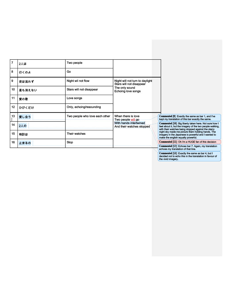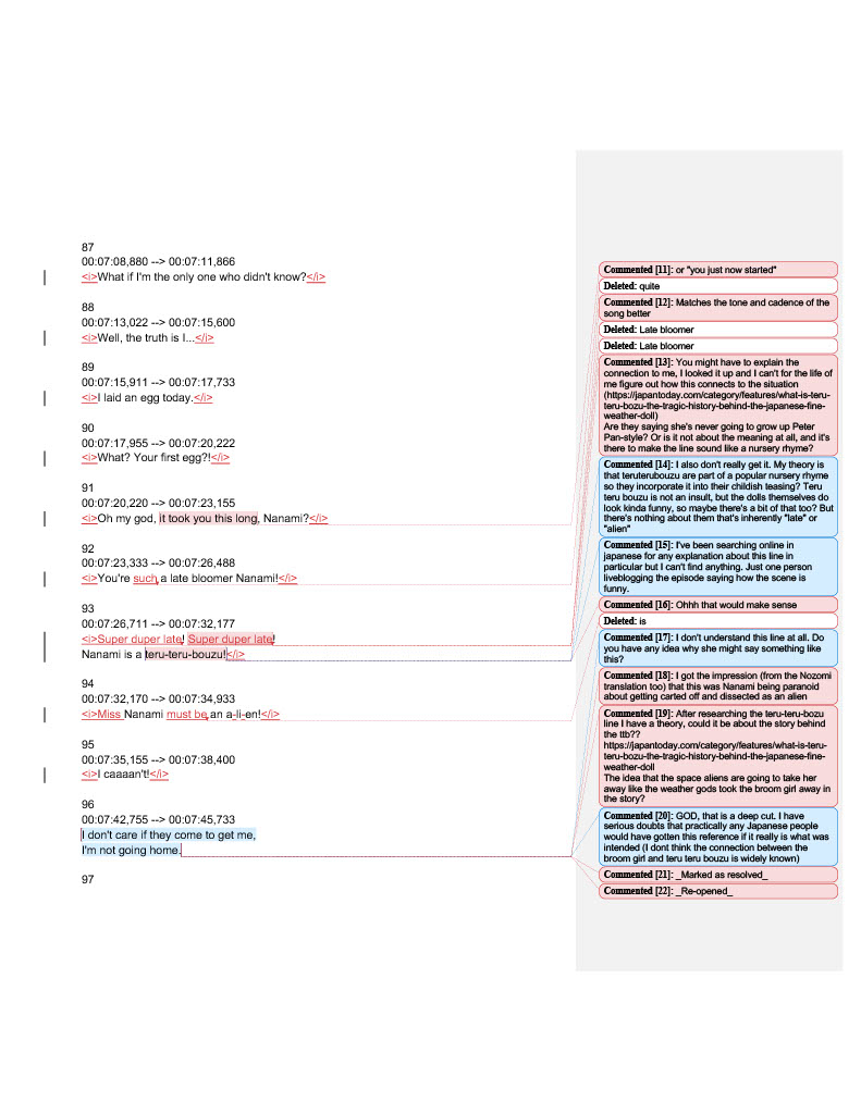 On a higher level, I provide structural and conceptual feedback on how concepts are conveyed cross-culturally in an English translation. This is especially relevant in situations where there are puns in the original Japanese that cannot be communicated word-for-word and have to be completely restructured. I act as a stand-in for the Western audience and ensure that the tone and content of the dialogue are both legible and accurate, challenging them on word choice, register, linguistic connotations, word structure, gendered language, and imagery.